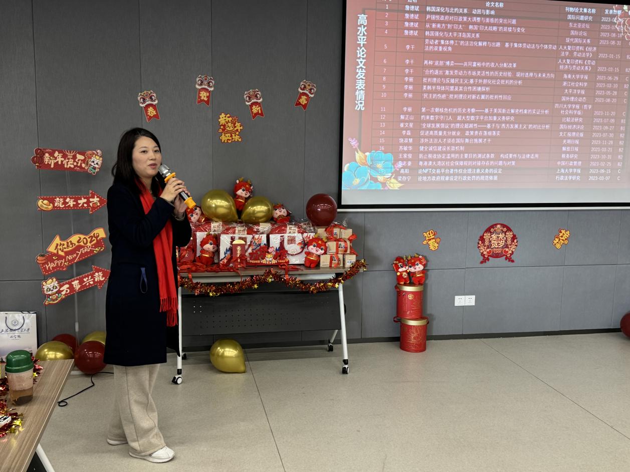1月11日下午,法学院举行“祥龙呈瑞迎春来,四十华诞谱新篇”2023年度总结表彰暨迎新茶话会。学院教师欢聚一堂,共叙感情,展望新春,共话发展。