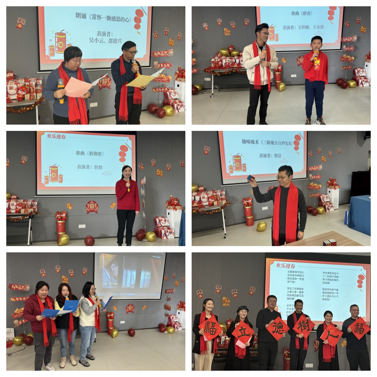 表彰过程中,还穿插诗朗诵、独唱、合唱、趣味魔方、三句半等形式多样、精彩纷呈的节目,不仅营造了喜庆祥和的迎春氛围,也增强了学院凝聚力和向心力。“击鼓传花”“谁是卧底”等游戏将现场欢乐气氛推向了高潮。