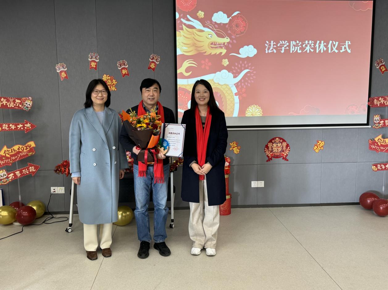 会议现场,学院还为今年退休的国际法学系张庆麟教授举行了荣休仪式,感谢其为法学院做出的积极贡献。黄静代表学院为张庆麟教授赠送荣休证书,国际法学系主任吴岚代表广大教师送上鲜花和祝福。