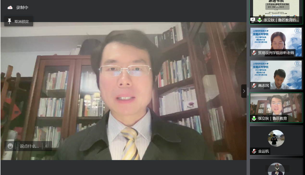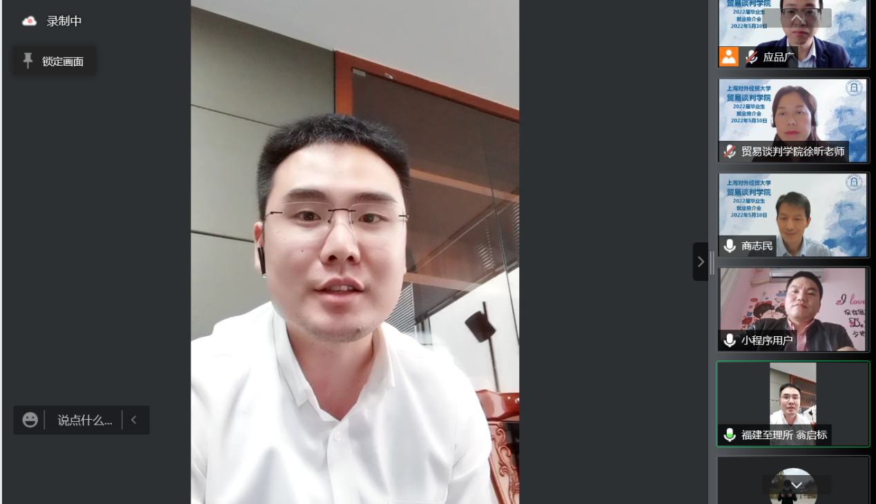 启动仪式后,商志民主持了用人单位宣讲环节。本次就业推介会共邀请到5家单位的相关负责人做了线上宣讲,分别是上海刘春雷律师事务所叶萍党支部书记、上海万赞网络科技有限公司张斌恒总裁、福建至理律师事务所翁启标合伙人、上海鲁匠教育科技有限公司张立秋总裁以及上海其新律师事务所候婷婷律师。
