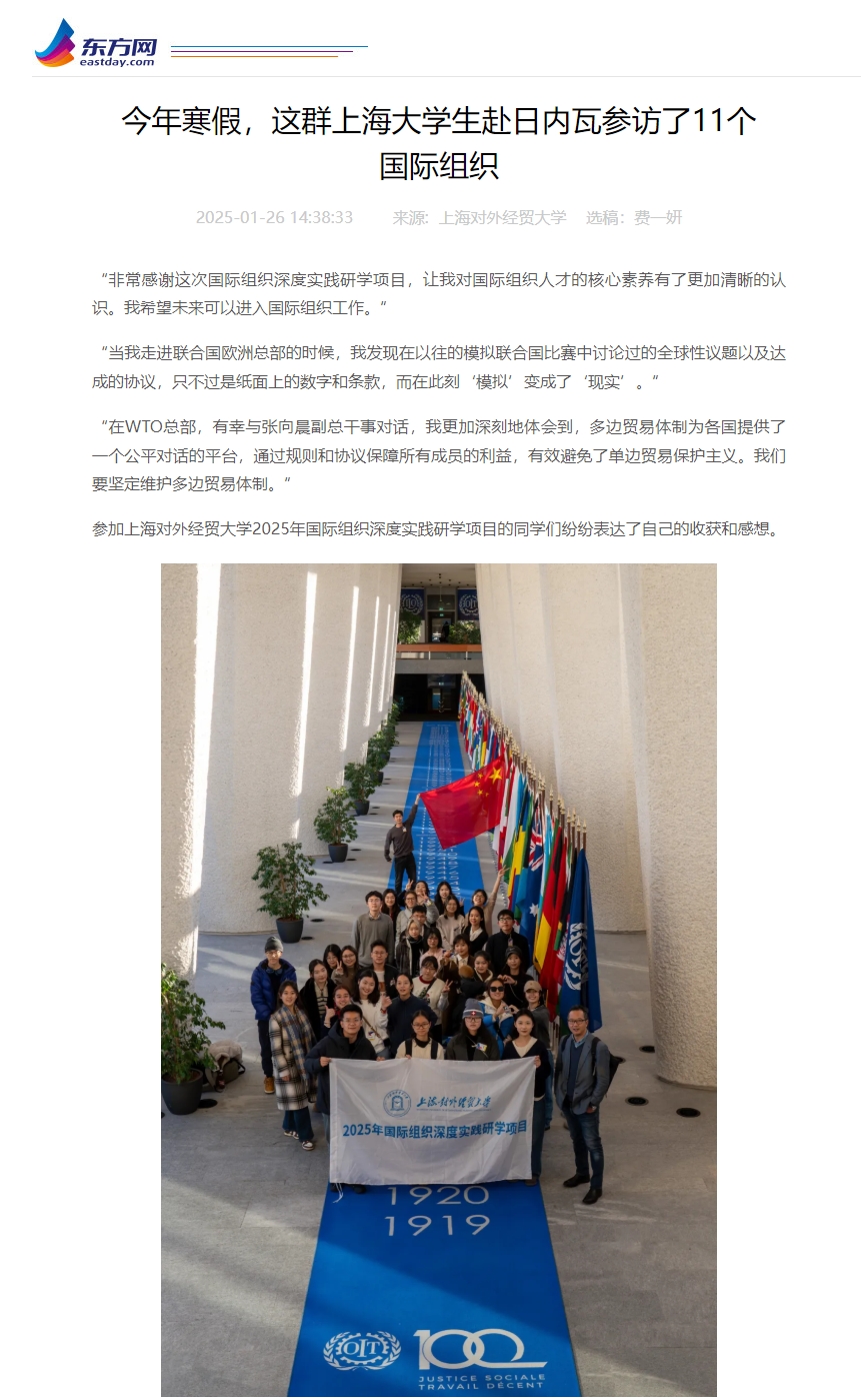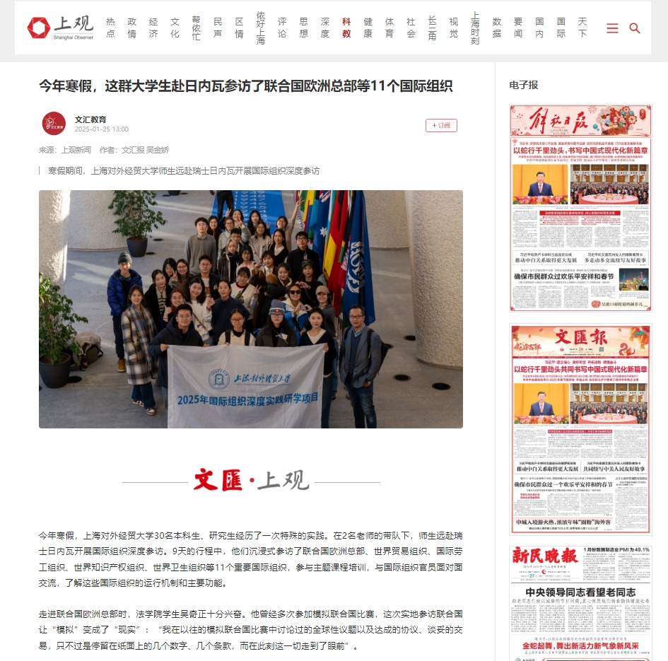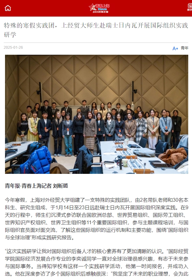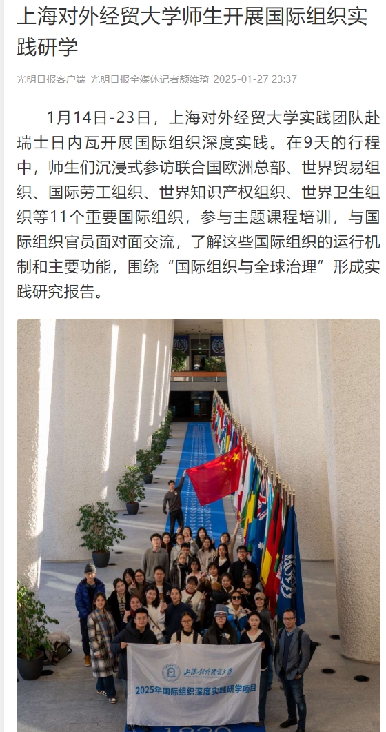 2025年寒假,上海对外经贸大学国际组织学院(贸易谈判学院)、全球胜任力中心共同举办国际组织深度实践研学项目,来自全校30名本科生和研究生,在2名老师的带队下,远赴瑞士日内瓦实践研学。研学期间,师生们在9天内沉式参访了联合国欧洲总部、世界贸易组织、国际劳工组织、世界知识产权组织等11个重要国际组织,参与主题课程培训,与国际组织官员面对面交流,了解这些国际组织的运行机制和主要功能,及其对国际事务的影响。实践研学活动获光明日报、文汇报、中国教育报、青年报、上观新闻、东方网、上海教育新闻网等多家媒体报道。