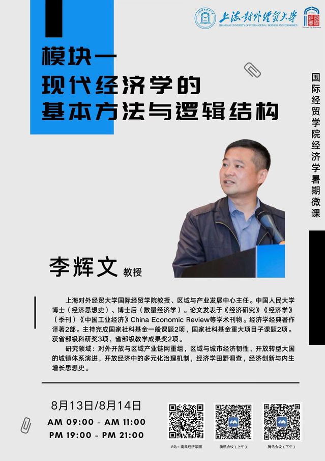 经济学暑期微课是国际经贸学院经济学系学科骨干面向全院学生开设的专业基础理论微型课程,目的是帮助学生夯实经济学专业基础理论与方法,提升应用经济学理论观察真实世界、发现高质量问题并进行专业分析的能力,进而提高批判性思维能力和学术写作能力,强化综合素质。经济学微课的主要内容包括政治经济学、微观经济学、宏观经济学、国际经济学和计量经济学的基本原理。