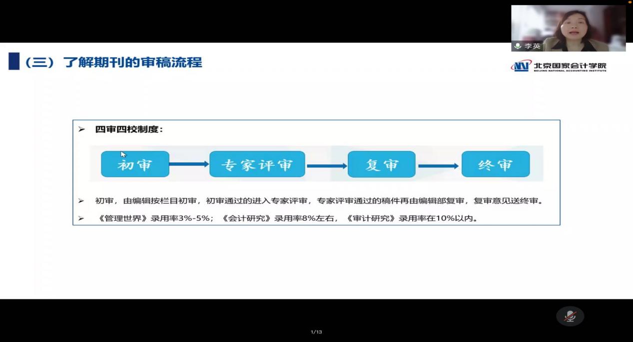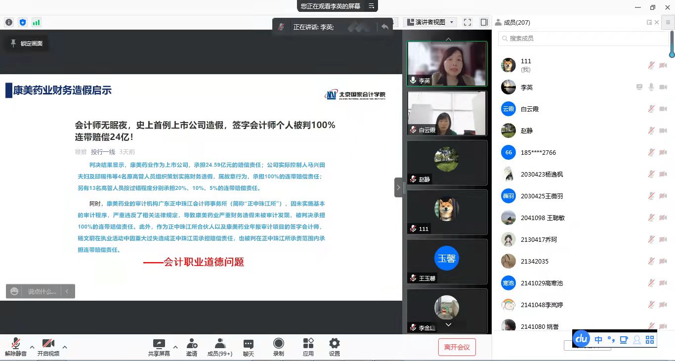 11月16日下午,北京国家会计学院副教授、硕士研究生导师李英通过腾讯会议面向同济大学经济与管理学院学生和我院研究生开展了一场主题为“会计理论创新”的学术讲座。本次讲座是财会审智能化推进联盟单位之间的优质讲座资源共享,学院研究生在线聆听了这场讲座。本次讲座内容围绕会计理论研究时代背景、基础科学进步与会计理论创新、会计理论和方法体系的反思、选题设计和提高投稿命中率的技巧五个方面展开。