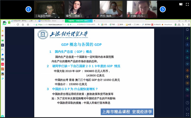 3月2日,国际经贸学院陆文安老师早早打开电脑,开启Zoom视频系统,测试耳麦,检查PPT课件、教学视频的播放情况,一切就序后,在课程微信群里给世界各地的同学们发出了准备上课的友情提醒。“老师,如果现在我去买入人民币,您觉得怎么样?”身在乌兹别克斯坦的GOYIBOV(李友)同学先一步登入课堂直播间,开门见山地向陆老师请教起他关注的汇率问题。“老师,我这里是早上3点钟,我可是设置了手机提醒来上课哦”,远在挪威的FREDRIK BERTEUS(福气)同学向老师和同学们打着招呼。待37名留学生聚齐《宏观经济学》课程“云端课堂”,陆老师以“新冠肺炎疫情对全球经济形势的影响”为题开始了新学期留学生课程直播第一课。