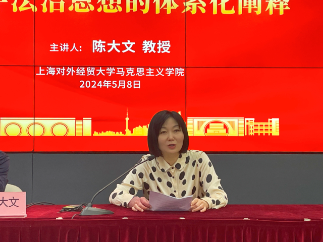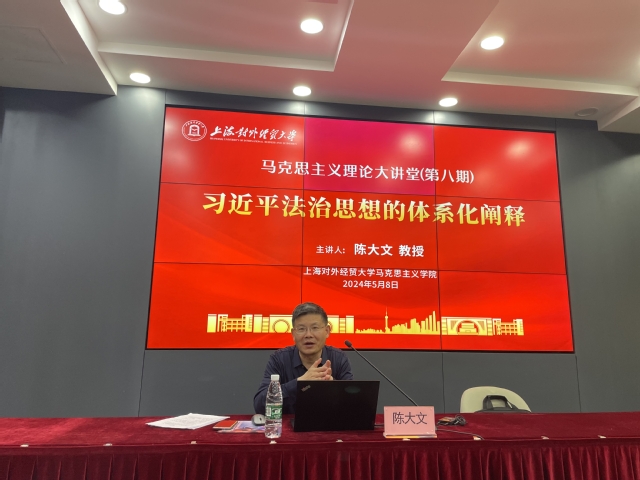 5月8日,马克思主义学院主办的“马克思主义理论大讲堂”第八期讲座开讲。为深刻领会习近平总书记关于依法治国的重要论述,进一步学懂弄通习近平法治思想,坚定不移走中国特色社会主义法治道路,本次讲座邀请了同济大学长聘教授、马克思主义学院学术委员会主任、国家“万人计划”教学名师陈大文教授作“习近平法治思想的体系化阐释”专题讲座。讲座由上海对外经贸大学马克思主义学院副院长(主持工作)庾向芳教授主持,马克思主义学院教师、研究生,以及学校本科生近百人现场聆听讲座。