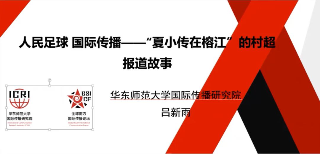 吕新雨院长做了题为《人民足球 国际传播——“夏小传在榕江”的村超报道故事》的主旨演讲。她以华师大国际传播研究院师生团队近期前往贵州榕江进行“村超”报道为例,深刻剖析了榕江借助现代传播手段,传播“村超”、助力脱贫攻坚、实现乡村振兴的故事。她提出了人民足球、国际传播的理念,认为会展、文旅体、传播融合发展将有助于理解推进中国式现代化、讲好中国故事的深刻内涵。