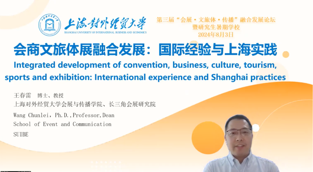 8月3日,由上海对外经贸大学、《中国贸易报》社和上海市会展行业协会联合主办,会展与传播学院、校研究生院和长三角会展研究院联合承办的2024第三届“会展·文旅体·传播”融合发展论坛暨研究生暑期学校开幕式和论坛主旨演讲在线顺利举行。全体研究生和教师在线参加,会展与传播学院视频号同步直播。开幕式由学院副院长田纪鹏主持。