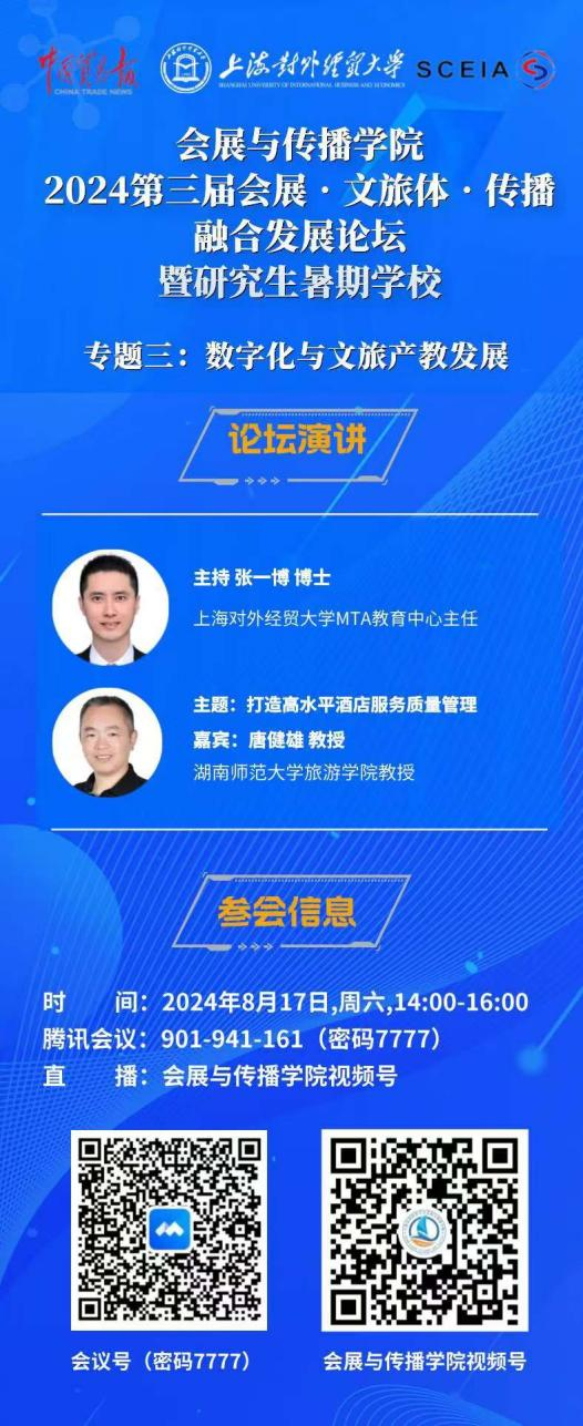 8月17日,由上海对外经贸大学、《中国贸易报》社和上海市会展行业协会主办,上海对外经贸大学会展与传播学院、上海对外经贸大学研究生院和长三角会展研究院承办的2024第三届“会展·文旅体·传播”融合发展论坛暨研究生暑期学校的“专题三:数字化与文旅产教发展”第一场论坛主题讲座在线顺利举行。湖南师范大学旅游学院教授、博士生导师唐健雄担任演讲嘉宾,论坛由上海对外经贸大学MTA教育中心主任张一博博士主持。
