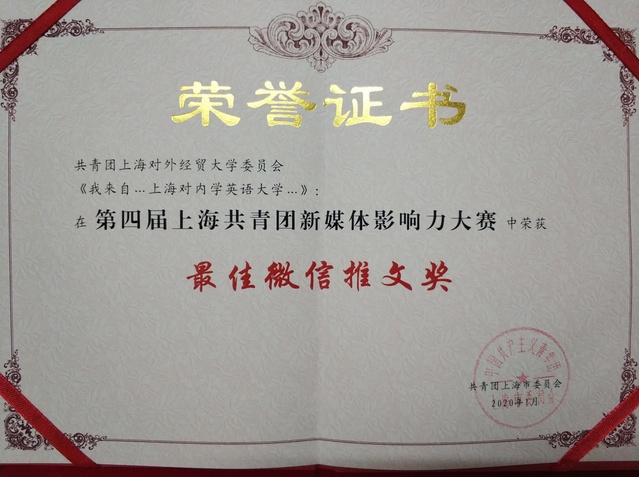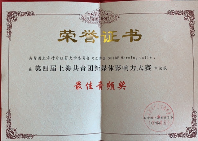1月3日,由共青团上海市委主办,青年报·青春上海媒体中心、上海共青团新媒体联盟承办的第四届上海共青团新媒体影响力大赛决赛暨颁奖仪式在上海世博会博物馆WE剧场举行。校团委申报的两项作品《我来自...上海对内学英语大学...》《进博会SUIBE Morning Call》分别获得“最佳微信推文奖”及“最佳音频奖”。