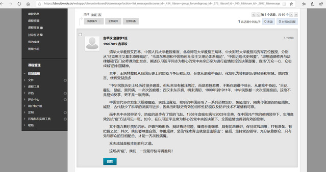 统计与信息学院汤靖翊:通过思政大课,我对人类和自然界之间的关系有了更加深刻的认知,我们必须改变对于自然的态度,要营造出人类和自然和谐共处的发展模式。拒绝食用野生动物,拒绝饲养野生动物作为宠物,从我做起。同时,这场防疫战是全球,乃至于全人类的共同战役,所有人都应该团结在一起,共同对抗这一次疫情。对于我国采取的有力的防控措施,国际上给予了高度的赞同,对于这次疫情可以看做是对于现阶段中国在实现中华民族伟大复兴路上的一次重大考验,相信国家一定能安然的度过此次疫情。