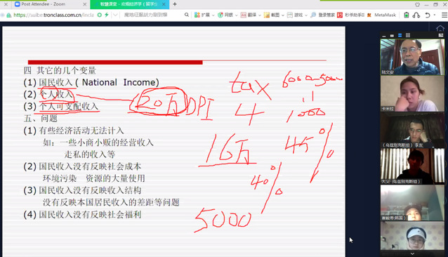 在讲解经济学知识的同时,陆文安老师还以润物无声的方式,向留学生讲述中国故事、传递中国文化。在线教学过程中,陆文安老师通过最新公布的中国2019年国内生产总值(GDP)数据,向同学们介绍中国经济发展取得的巨大成就,讲述新冠肺炎疫情发生以来,中国举国上下共同抗击疫情,并出台一系列财政货币政策以降低疫情对经济的影响。他还结合近期世界金融市场的剧烈动荡形势,分析疫情对世界经济、贸易、金融的影响。他希望留学生在学习《宏观经济学》课程后,能更好地用经济学思维去构建养成更为宏观、全局化的思考方式。