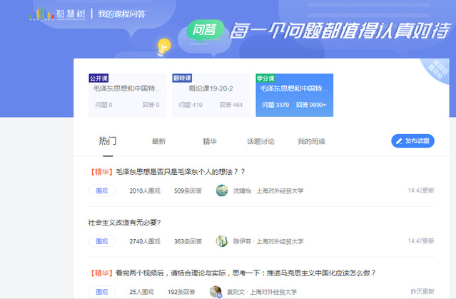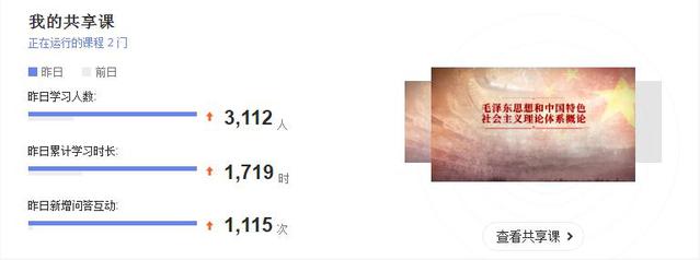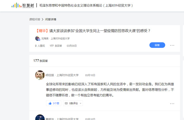 走出去。“毛泽东思想和中国特色社会主义理论体系概论”(以下简称“概论”)课程于2019年建成在线开放课程,已在智慧树平台开课3期,具有完整的课程教学视频和丰富的线上教学资源。结合本学期学校在线教学总体要求,教学团队依托在线课程资源和前期建设基础,着力从三个方面推进在线教学改革工作,一是进一步优化教学设计,做好本校学生在线修读“概论”课程的教学方案与实施。二是共建共享,为兄弟高校提供“概论”课程在线教学支持,目前已有喀什大学等9所高校引进我校“概论”课程,万余名学生参加在线学习。三是加强在线研讨组织与引导,多个热点话题引起学生关注,有的关注人数高达2,000余人,在线教学两周以来,师生互动已超过10,000余次。