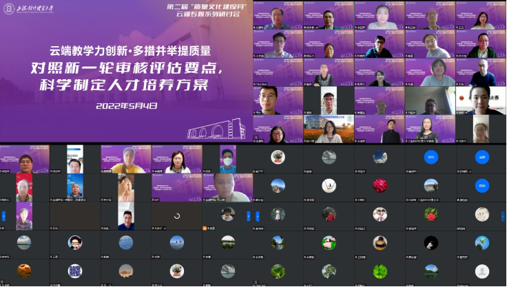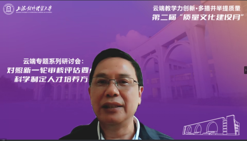 为深入推进学校人才培养模式改革,进一步提升人才培养质量,确保2022级本科人才培养方案制定工作科学、有序开展,为学校迎接2023年下半年审核评估做好充分准备,5月4日下午,学校举办SUIBE“云端专题研讨会”系列活动——“对照新一轮审核评估要点,科学制定人才培养方案”研讨会,特邀教育部电子商务类教学指导委员会委员、东华大学姚卫新教授作专题讲座。副校长徐永林出席会议,各教学单位副院长、各系/专业/教研室主任、教务处相关人员等90余位教师参加。