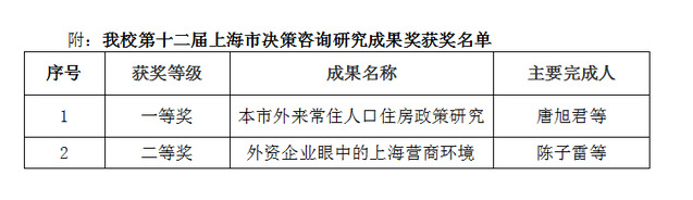 近日,上海市人民政府发展研究中心网站公布了第十二届上海市决策咨询研究成果奖获奖名单,我校有两位学者的2项成果获奖,其中一等奖1项、二等奖1项(具体获奖情况见附表)。