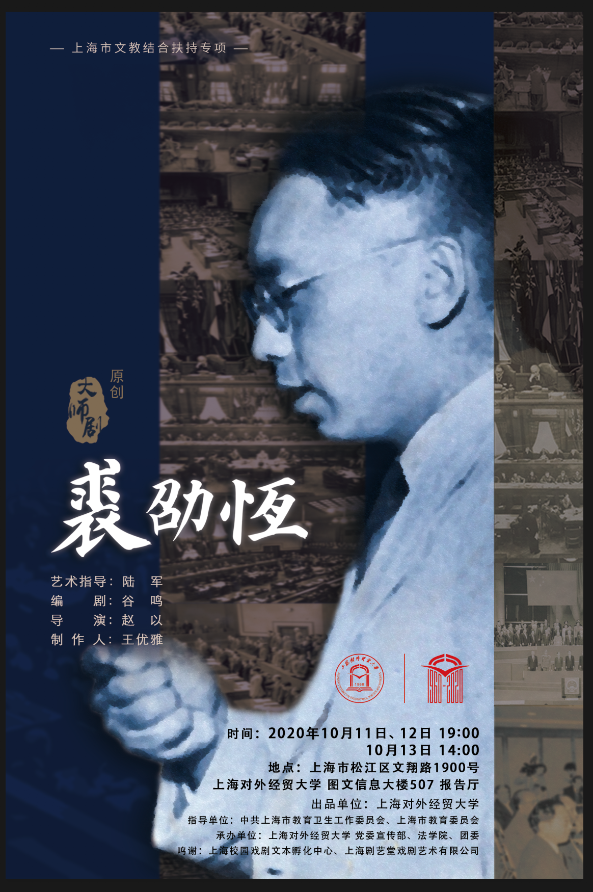 大师剧《裘劭恒》是上海市文教结合扶持项目,由我校出品,党委宣传部、法学院和校团委具体承办。大师剧由上海戏剧学院著名编剧陆军教授担任艺术指导,黄溪教授担任编剧,“90”后新生代导演赵以执导,戏剧教育培训师王优雅担任制作人,所有演员全部由我校学生担任。自201812月剧目获得立项以来,创作团队查阅了大量裘劭恒教授相关史料,采访了裘劭恒教授家属、同事、学生、好友等20多人收集相关素材,潜心于剧本创作。在历经十余稿的修改后,大师剧《裘劭恒》剧本创作完成。在大师剧排演过程中,我校参演学生放弃暑假休息时间,克服疫情影响,认真学习台词对白、形体动作、神态表情等演出技巧。大家冒着酷暑一遍又一遍的排练,不断完善每个动作、每句台词,体现了爱校情怀和奉献精神。在排演的过程中,学生进一步感受了裘劭恒教授伟大的爱国情怀、崇高的精神品质和严谨的治学精神,并把这种精神转化为演好大师剧的强大动力。