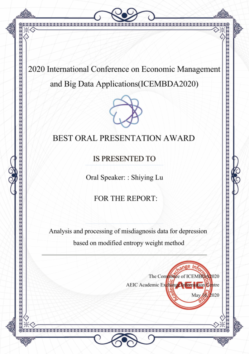 陆诗颖同学分享的论文题目为“Analysis and processing of misdiagnosis data for depression based on modified entropy weight method”,本论文基于抑郁症误诊数据的分析处理,通过结合序关系分析法与多元回归分析,修正了熵权与熵值传递关系不一致的问题,有效避免过于主观而造成的片面评估结果,不仅提高了算法的快捷性与实用性,而且使得对抑郁症误诊数据的分析更加客观准确,能够得到多方面的应用与拓展。该论文在口头报告中取得第一名的好成绩并获得最佳论文证书。