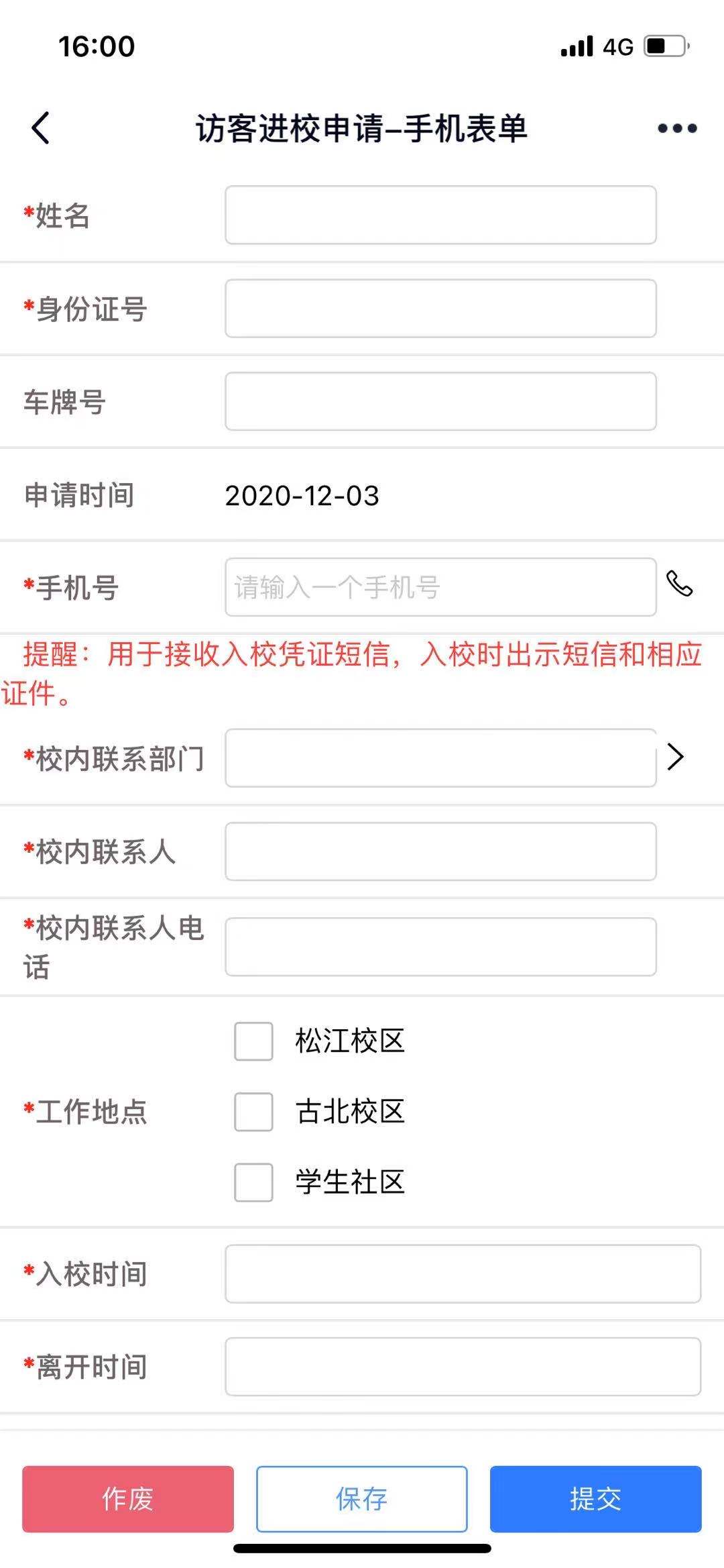 凡外来人员进校报备,须至少提前1天由外来访客或部门联系老师扫描“访客进校申请二维码”,按照要求如实登记进校人员的“姓名、身份证号、车牌号、手机号、校内联系部门、校内联系人、校内联系人电话、办公地点、入校时间、离开时间、入校事由等事项”并按提示上传“本人随身码截图”,完成后点击提交即可。