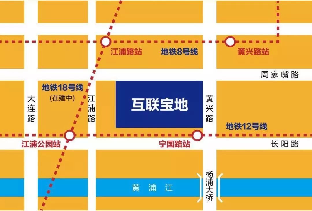 互联宝地,位于杨浦区核心板块,紧邻内环杨浦大桥上匝道口及北横通道,8号线(江浦路站、黄兴路站)、12号线(宁国路站)可达。