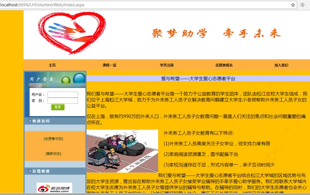 “爱与希望——大学生爱心志愿者平台”针对近年来外来务工人员子女的教育这一热点问题进行展开,外来务工人员的家长望子成龙、望女成凤,但是迫于自己受到的教育较少、文化较低、收入水平也有限,无法支持子女接受到良好的教育;其次,由于外来务工人员平常大多外出打工,没有足够的时间去教育、陪伴以及监管子女,造成了他们的子女不能及时受到教育,在价值观、思想观上容易走偏,因而,为外来务工人员子女提供教育机会事关社会民生和稳定。本作品从信息技术解决问题视角出发,基于Visual studio 2010的C#和SQL Server2008技术开发了面向志愿者教师和面向待接受教育家庭的网上平台,为缓解外来务工人员子女教育缺失的现状出一份绵薄之力。