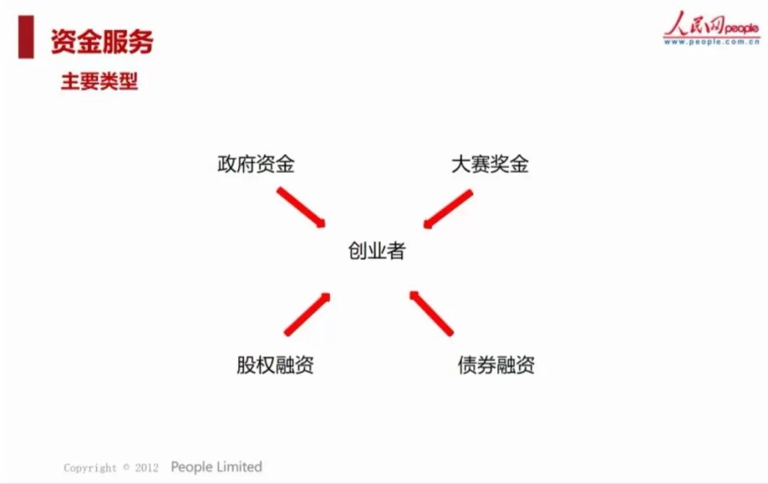 资金服务的主要类型包括政府资金、大赛奖金、股权融资和债券融资。