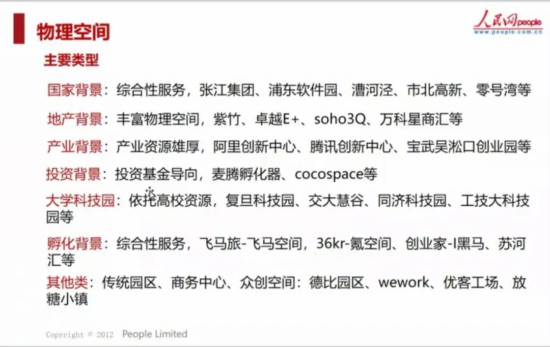 物理空间的主要类型有:国家背景为创业者提供综合性服务,如张江集团、浦东软件园等;地产背景为创业者提供了丰富的物理空间,如紫竹、卓越E+等;产业背景有雄厚的资源,如阿里创新中心、腾讯创新中心等;投资背景有很多自己的专属孵化机构,如麦腾孵化器、cocospace等;还有教育背景为很多依托高校资源的大学科技园,如复旦科技园、交大慧谷等。通过这些物理空间创业者可以获得较为完善的服务体系。