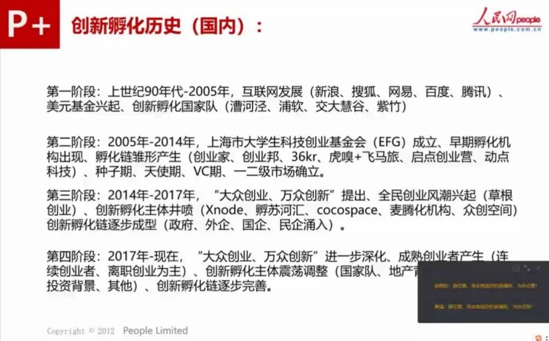 首先老师介绍了国内创新孵化的历史,我国的创新孵化历史从上世纪90年代开始至今经过了四个阶段:第一阶段在上世纪90年代至2005年,随着互联网的发展以及美元基金的兴起,出现了创业孵化国家队,如漕河泾、浦软等。第二阶段处于2005年至2014年,,此时早起孵化机构出现,孵化链雏形产生。第三阶段处于2014年至2017年,全民创业风潮兴起,创新孵化链逐步成型。第四阶段为2017年到现在,此阶段产生了成熟的创业者,创新孵化链逐步完善。
