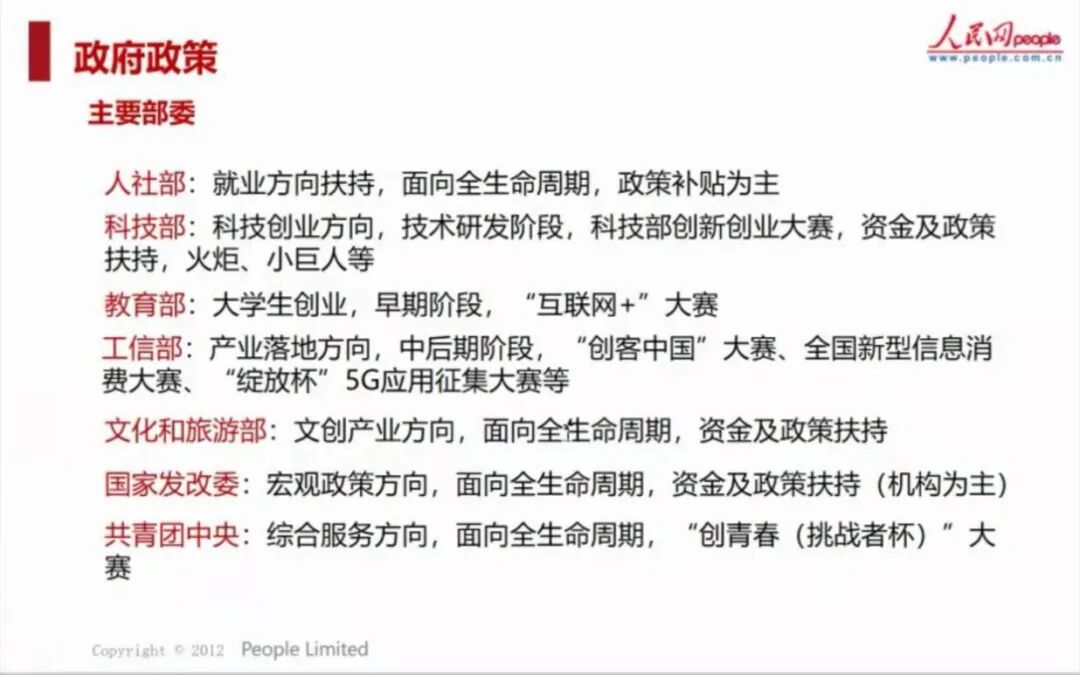 在创业过程中,一些政府部委与我们息息相关,如人社部、科技部、教育部、工信部、文化和旅游部、发改委、共青团中央等各级部委会给我们提供很多创业上的政策支持,如各项创新创业类比赛,创业资金支持、创业场地房租补贴等。