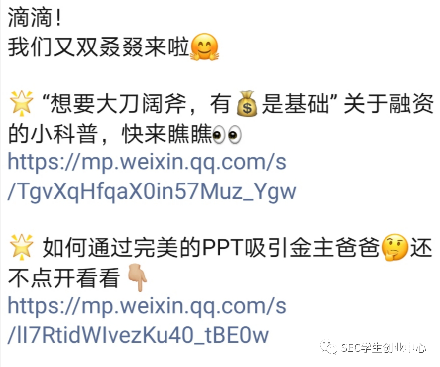 而预热群内每天也是高潮迭起,总有一份惊喜礼包在晚上等着你!从创业政策解读到思维导图PPT合集,从创赛经验分享到融资科普,从创业必备公众号安利到相关书籍电影推荐……我们的群助手每天都会在群里分享与创业相关的n个小知识,确保同学们能在本次的活动中满载而归。