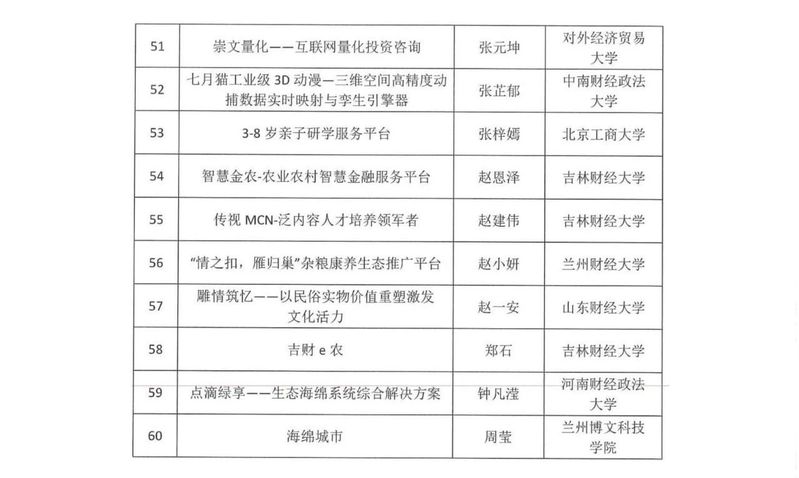 近日,全国财经院校创新创新联盟、第六届全国财经院校创新创业大赛组委会公布了入围决赛名单,我校有杨潜羽同学负责的《绘吉——以吉林省文化资源为依托的个性化美工设计平台》项目晋级,具体名单如下: