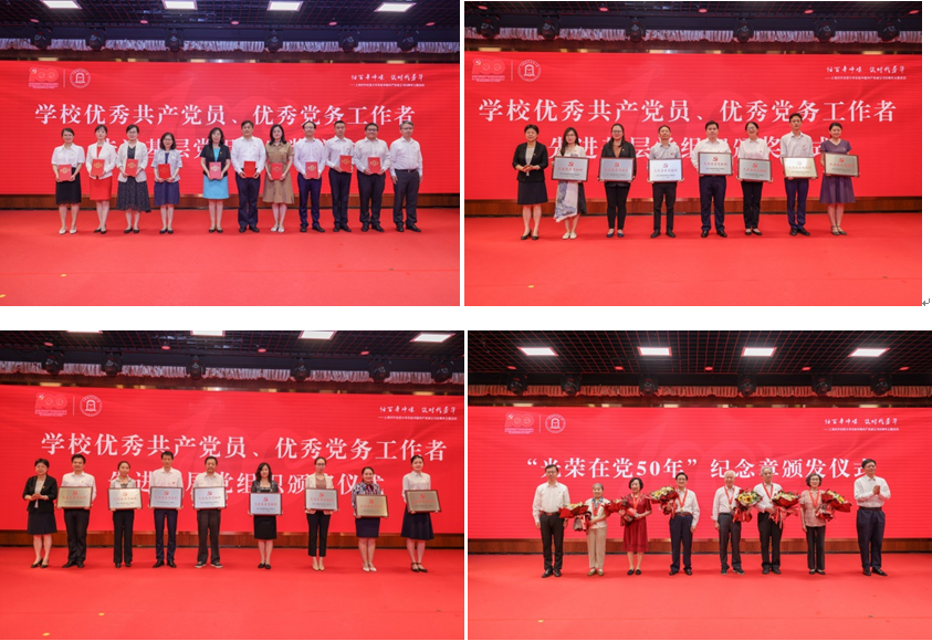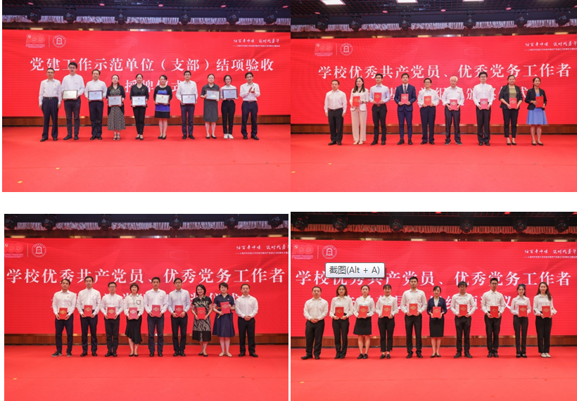 第三篇章,学校举行了隆重的表彰仪式。对学校第二批党建工作示范单位(支部)进行了结项验收授牌。校领导分别向获校级表彰的优秀共产党员、优秀党务工作者、先进基层党组织进行颁奖。今年党中央决定首次颁发“光荣在党50年”纪念章,学校领导向获得纪念章的我校55名老党员代表颁发纪念章。
