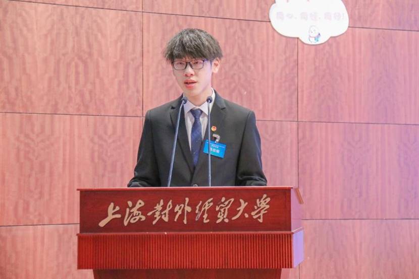 在庄严的中华人民共和国国歌声中,大会正式开始。首先,金融管理学院学生会执行主席奚骏同学上台为本次大会致开幕词。奚骏同学指出,在学生会改革的背景下,2020年秋季学院团委整合了学院原学生会与易班工作站的相关资源,精简学生会人数,构建出了以八大中心为平台的全新团学工作格局,让金融管理学院团委、学生会踏上了全新的征程。虽然这伴随而来的是全新的工作挑战与成员磨合,但是金融团学在这一过程中始终不忘初心、砥砺前行,秉持“以学生为本”的服务理念,团学八大中心积极开展工作,坚持从同学中来,到同学中去,只为给同学们提供最优质的服务。为了更好地履行学院学生代表大会维护同学权益的职能,奚骏同学呼吁各位代表积极履行代表职责,行使代表权利,在学生代表大会的学生提案征集环节中提出自己对学院与学校的建设意见,为学院与学校更好的发展贡献自己的力量。发言最后,奚骏同学也表达了对下一届金融团学工作的美好祝福与期望。