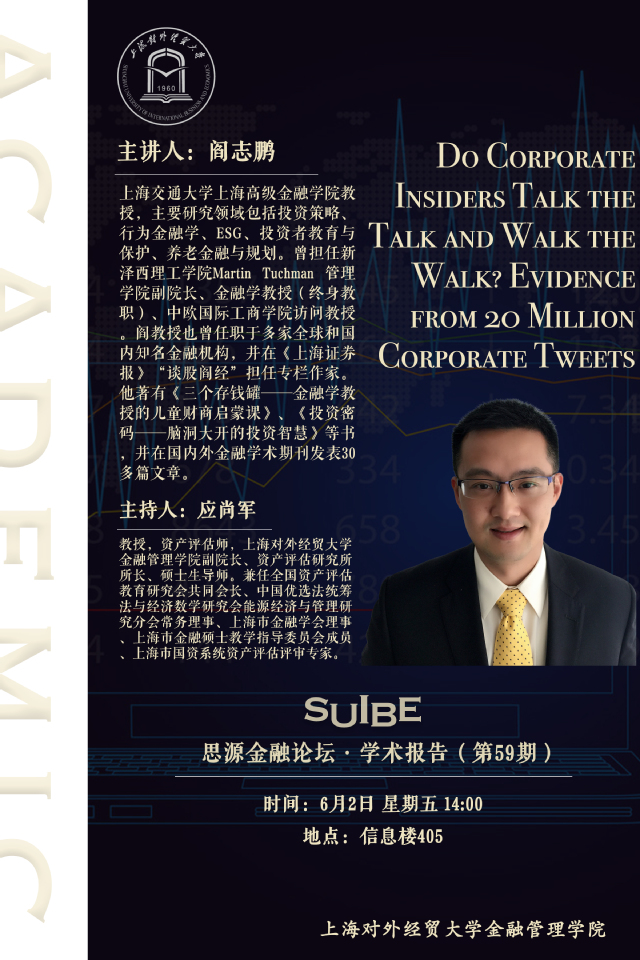 【SUIBE思源金融论坛——学术报告第59期】Do Corporate Insiders Talk the Talk and Walk the Walk? Evidence from 20 Million Corporate Tweets