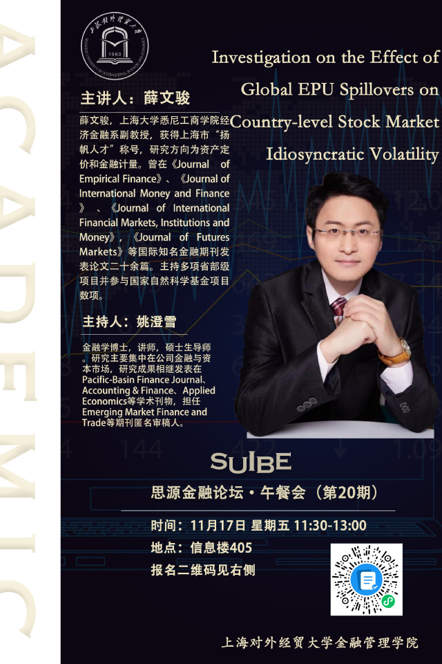 【SUIBE思源金融论坛——午餐会第20期】Investigation on the Effect of Global EPU Spillovers on Country-level Stock Market Idiosyncratic Volatility