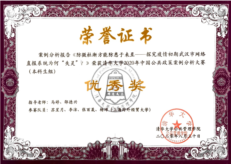 法学院“贸大筑梦队”在法学院公共管理学系专业老师的精心指导下,经过近4个月的充分准备,从初赛选题方向的切换,到决赛的汇报展示与答辩环节,团结协作,精益求精,开展网络直报系统相关问题的线上调研,顺利完成了《防微杜渐方能防患于未至——探究疫情初期武汉市网络直报系统为何“失灵”?》的案例报告撰写。我院参赛队伍从实际案例出发,结合公共管理专业知识,科学、细致地分析了该案例中的公共政策问题,沉着应对答辩,充分展示了我校学生的专业能力,积极投身公共管理事业的抱负和理想,最终荣膺本次大赛优秀奖。