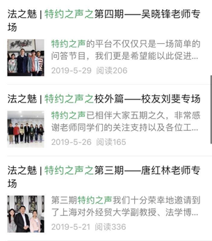 交流与线上宣传展示相结合的访谈类活动。该活动的交流话题包括时事热点、热门事件中的法律问题、学术性法律问题等等,将学术讨论与实践法律问题相结合,具体通过前期的话题讨论以及问题征集、嘉宾对于专门主题的探讨以及问题的答疑,致力于为师生搭建课外交流平台,以轻松活跃的氛围和形式引导同学关注并正确理解社会热点问题。通过与老师、校友的别开生面的交流,同学们接触了更多知识的实际应用,拉近了师生距离,收获了师生、校友的一致好评。