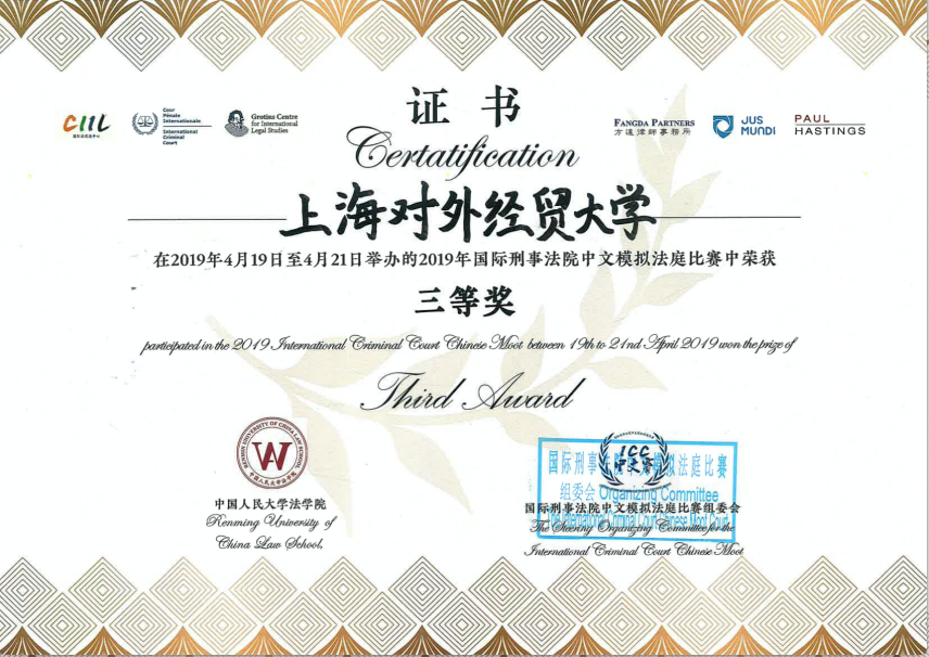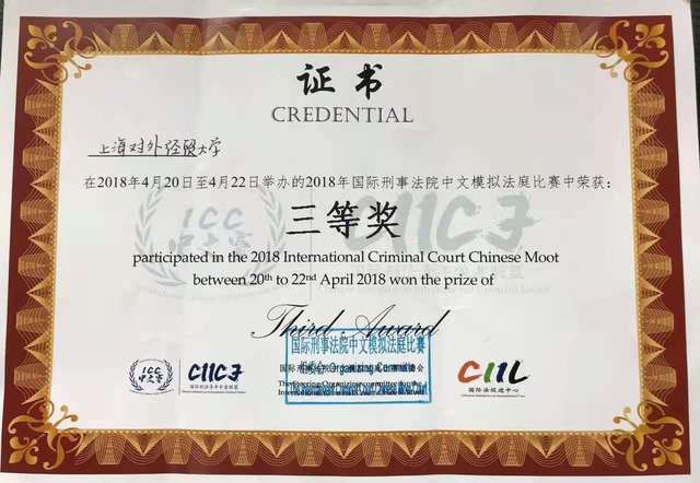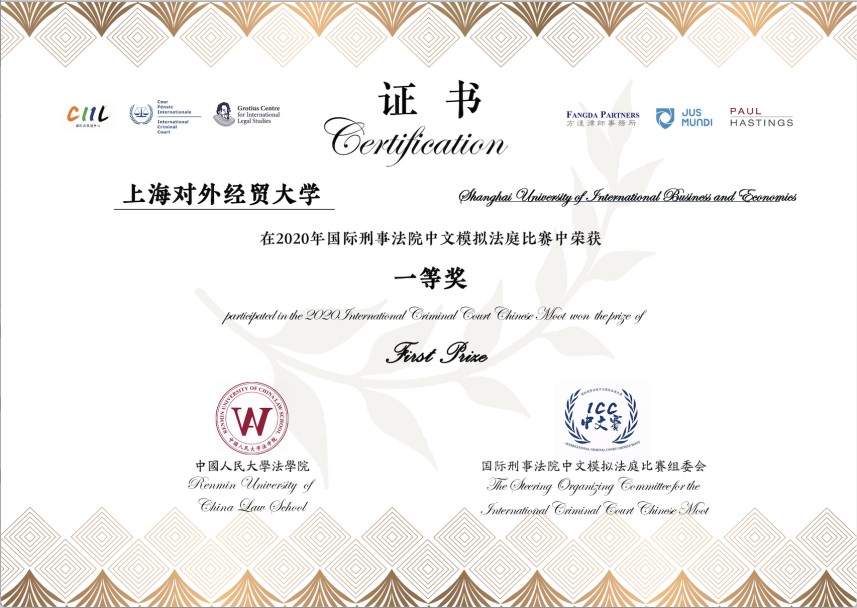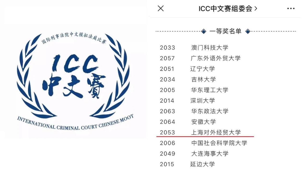 2017年,上海对外经贸大学法学院首次组建代表队参赛,并于2018年、2019年连续两年获得ICC中文赛的全国三等奖。2020年,在参赛队员和指导教练的共同努力下,上海对外经贸大学代表队首次取得ICC中文赛的全国一等奖,并进入荷兰海牙的国际决赛轮。