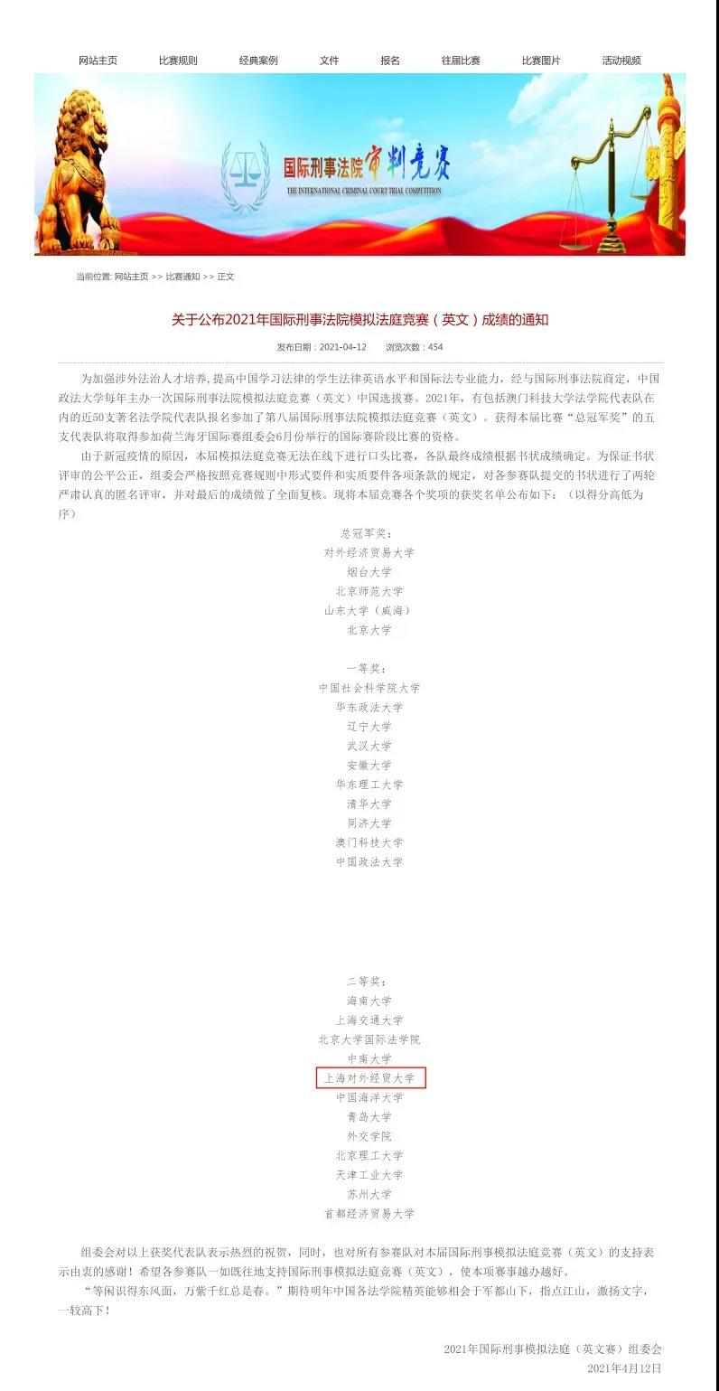 法学院坚持以培养涉外卓越法律人才为办学特色,鼓励学生积极参加各类学术竞赛,近年在国际刑事法院模拟法庭赛事中不断取得优良成绩。2017年,首次组代参加国际刑事法院模拟法庭竞赛(中文赛),2018年、2019年连续两次获得该赛事中文赛全国三等奖;2020年取得全国一等奖的优异成绩,并获得于荷兰海牙举办的国际决赛轮的参赛资格。近年来取得的成绩充分展示出学院国际法学科建设和涉外法治人才培养的成果,相信在未来的国际模拟法庭赛场上,上海对外经贸大学法学院代表队能够取得更多更优异的成绩!