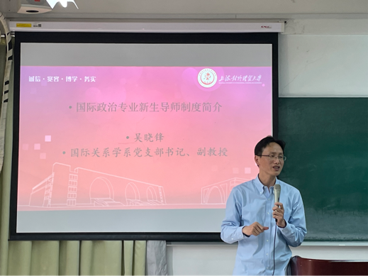 国际关系学系教工党支部书记吴晓锋老师首先介绍了国际政治专业新生导师制度的设计初衷。在安排一名专业教师担任班主任之外,学系鼓励所有专业教师担任新生导师,旨在对新生的学习生活开展个性化、针对性的精准帮扶,积极引导大一学生更快更好地完成从高中生到大学生的角色转变。
