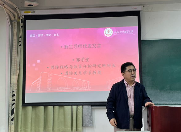 随后,国际关系学系的郭学堂教授、詹德斌教授和樊冰博士作为新生导师代表先后发言。郭学堂教授以形象的“三子”比喻(脑瓜子、嘴皮子、笔杆子)寄语新生在大学四年里学好本领,增长才干。詹德斌教授告诫新生要平衡好学习与生活、专业与非专业、现在与未来的关系。樊冰博士则点出大学生锻炼思维能力的重要性。