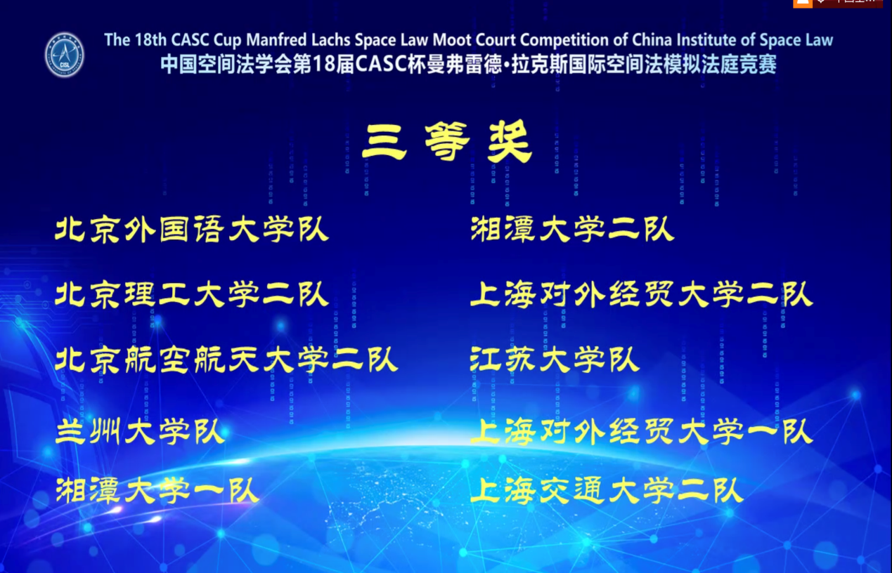2021年12月10日至12日,由外交部条法司指导、中国空间法学会主办的第18届CASC杯曼弗雷德·拉克斯国际空间法模拟法庭竞赛以线上方式举行,吸引了全国30支高校队伍参赛。经过激烈角逐,上海对外经贸大学法学院代表队表现出色,与北京大学、上海交通大学、武汉大学、北京理工大学、北京航空航天大学、兰州大学、中国政法大学、北京外国语大学等12所著名高校共同晋级决赛圈,最终荣获全国三等奖。