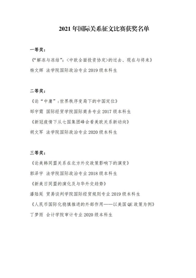 本次征文活动共收到本科生论文二十多篇,学生来自全校不同院系、不同专业。获奖论文中,既有像郭泽宇《论美韩同盟在北方外交政策影响下的演变》等聚焦于传统国家间关系与外交政策的作品,也有与国际经济金融领域跨专业融合的作品,还有如邹宇霆同学《论“中庸”:世界秩序变局下的中国定位》等立足于中华优秀传统文化深厚养分、与当代中国现实相结合的佳作,充分展现了我校学子广博的知识面、精深的专业知识,以及连接当代中国过去与未来的使命意识。