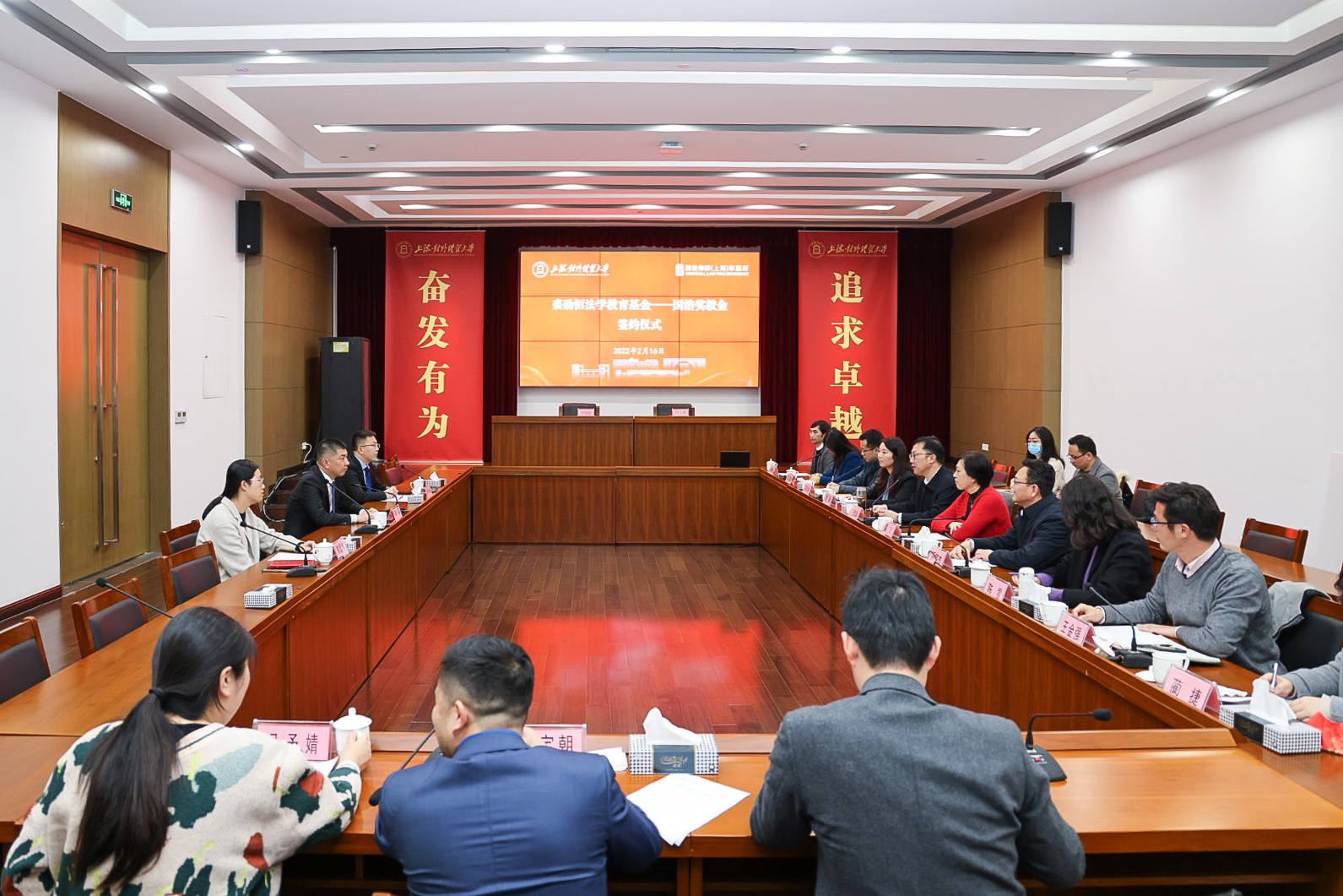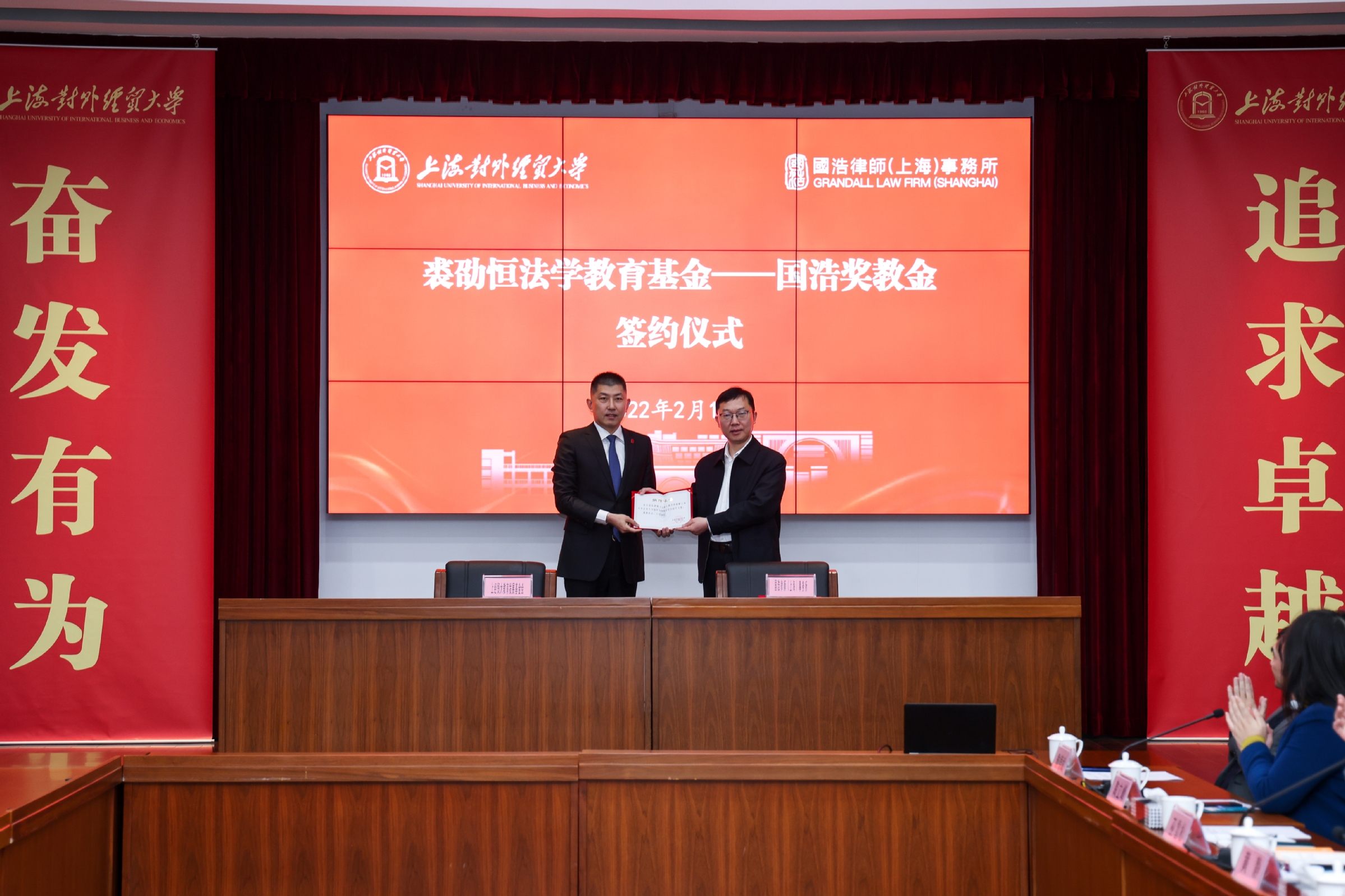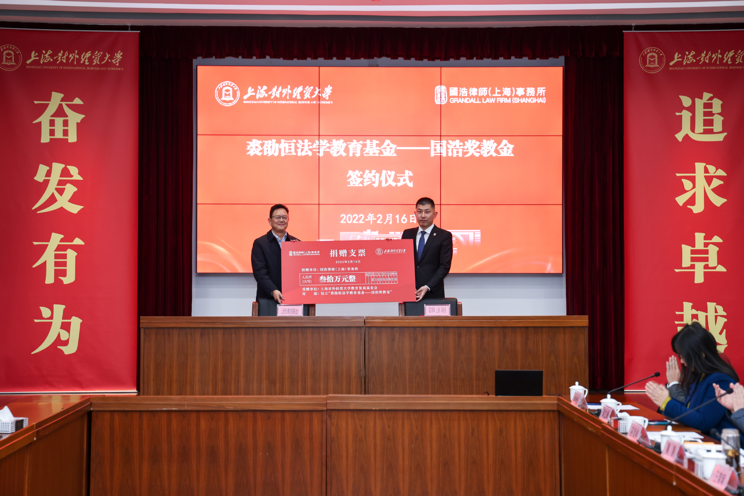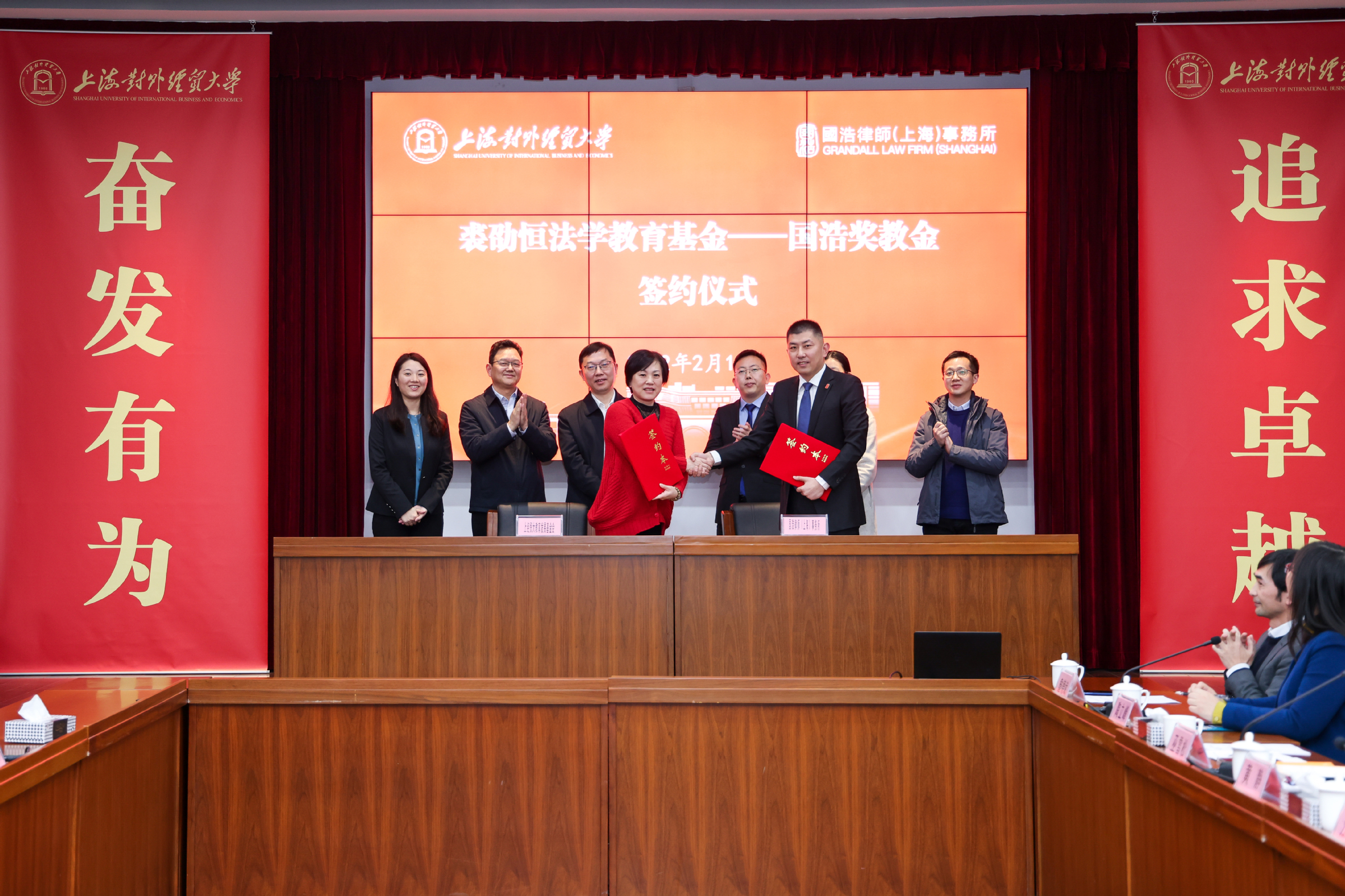 2月16日,“裘劭恒法学教育基金——国浩奖教金”签约仪式在古北校区综合楼510室举行。校长汪荣明出席仪式并讲话。国浩律师(上海)事务所主任、管理合伙人李强,合伙人乔营强,行政主管陈彦彬,学校校友工作联络处处长、教育发展基金会秘书长晏琼,法学院党委书记黄静,院长乔宝杰,学校办副主任巫雪松以及法学院领导班子其他成员、学院师生代表等参加签约仪式。会议由黄静主持。