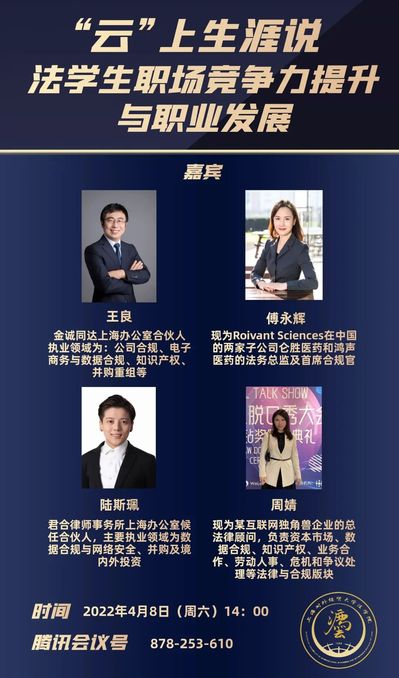 活动邀请了来自知名律所、企业法务方面的4位嘉宾在线上为学生进行行业信息分享和法律专业学生的求职指导。法学院党委书记黄静、法学院易班工作站指导老师、学生工作团队就业主管闵时涛出席,学院本研学生200余名共同参加活动。