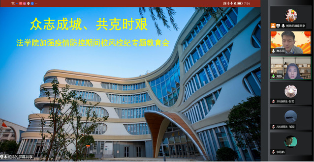 为进一步贯彻落实上级和学校疫情防控决策部署,不折不扣落实学校防疫要求,把对在校学生身心健康的关心关爱融入学生的思想教育引导中,法学院党委在4月16日晚召开“众志成城、攻克时艰——法学院学生疫情防控校风校纪教育会”。学院党委书记黄静、党委副书记商志民出席会议,古北校区学生辅导员杨杨主持,法学院古北校区全体学生参会。