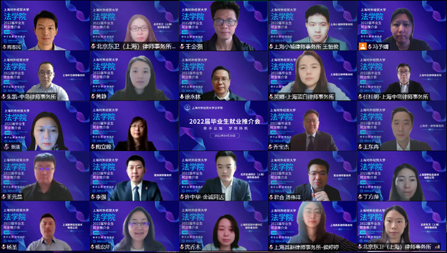 副校长徐永林出席本次推介会启动仪式。来自君合律师事务所、国浩律师事务所、上海市锦天城律师事务所、北京金诚同达(上海)律师事务所、上海浙实企业发展集团有限公司、金元顺安基金管理有限公司等在内的22家用人单位负责人及代表、法学院领导班子、教师代表、辅导员和200多名学生在线参加推介会。启动仪式由法学院党委副书记商志民主持。
