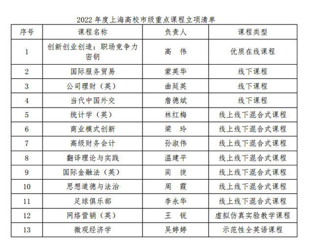 近日,上海市教委发布了《上海市教育委员会关于公布2022年度上海高校市级重点课程立项名单的通知》(沪教委高〔2022〕27号),我校申报的《创新创业创造:职场竞争力密钥》等13门课程全部获得立项。其中,优质在线课程1门,线下课程3门,线上线下混合式课程7门,虚拟仿真实验教学课程1门,示范性全英语课程1门。