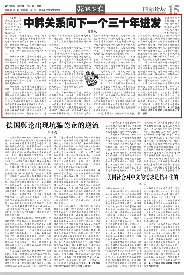 8月22日,法学院詹德斌教授在《环球时报》刊发题为《中韩关系向下一个三十年进发》的署名时评文章,以纪念8月24日中韩建交三十周年,文章阐述了中韩关系进入转型期,推动两国关系继续健康发展的三点思考。詹德斌认为:中韩两国宜探索达成新的战略共识,在两国建交三十周年之际重温初心,把发展两国关系的主动权牢牢把握在两国手中。中韩两国宜持续推进解困增利的务实政策,继续秉持实用外交,不将意识形态引入双边关系;积极化解既有矛盾,不将民间争论政治化;继续扩大利益交融,不人为推动“经济脱钩”。中韩两国民间宜进一步增进交流,加强相互尊重,共同面向未来推动中韩关系持续健康发展。