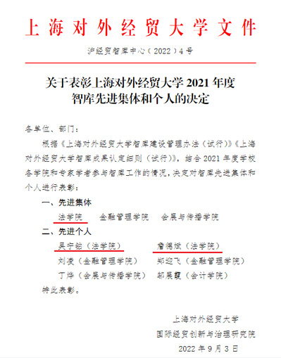 9月13日上海对外经贸大学召开2021年度智库工作总结会,会上对学校智库先进集体和先进个人进行了表彰。法学院荣获智库先进集体,我院吴宁铂、詹德斌两位教师被荣获智库先进个人称号。