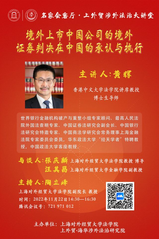 讲座预告|黄辉教授:境外上市中国公司的境外证券判决在中国的承认与执行