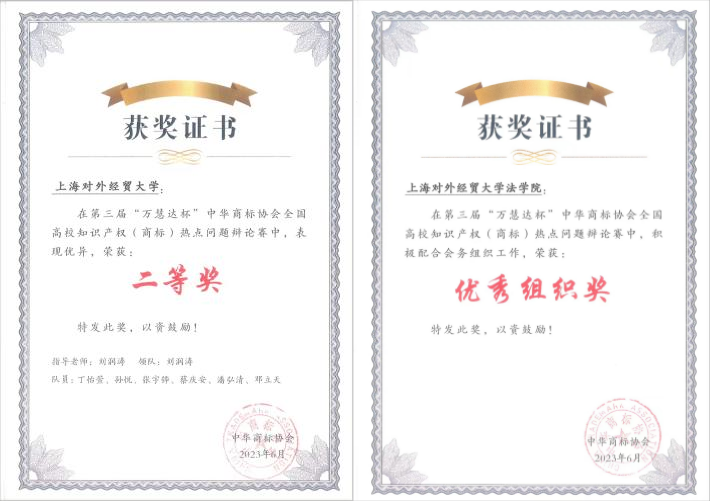近日,第三届“万慧达杯”中华商标协会全国高校知识产权(商标)热点问题辩论赛在2023中国国际商标品牌节落下帷幕。来自北京大学、清华大学、中国人民大学、中国政法大学、同济大学、华东政法大学、上海大学、上海对外经贸大学等全国范围内三十多所高校参加本届辩论赛。历经多轮激烈角逐,我校代表队荣获全国二等奖,我校法学院获“优秀组织奖”。